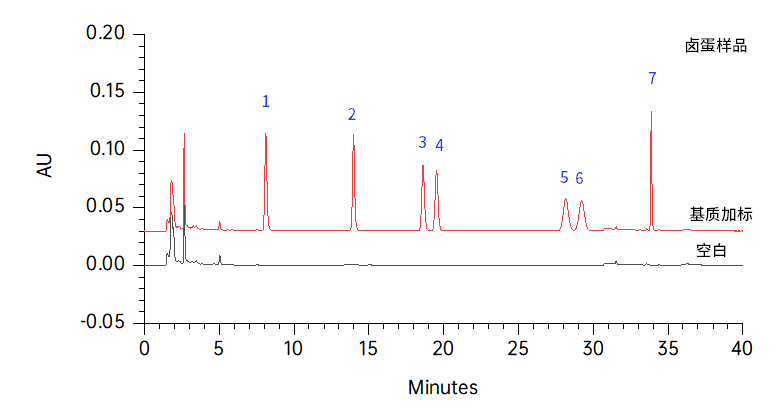 参考国标方法,对酱油、果酱、卤蛋样品进行前处理检测,加标量为10LOQ。酱油和果酱样品中七种目标化合物的回收率均大于90%,卤蛋样品中七种目标化合物的回收率均大于75%。